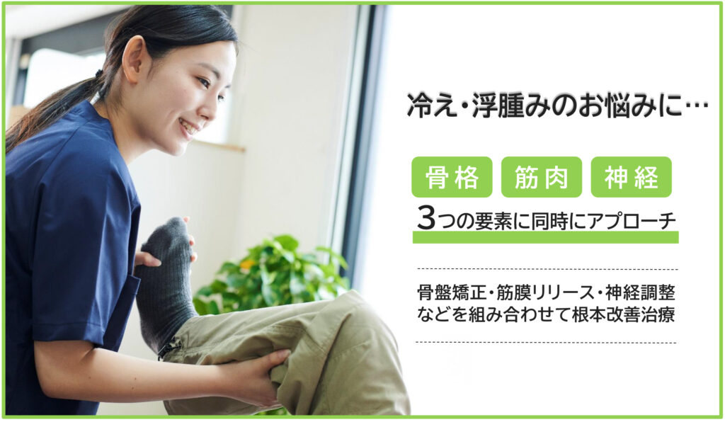 整骨院では、冷えや浮腫みに対し、単なる症状緩和に留まらず、その根本原因である身体の歪みや自律神経の乱れにアプローチします。
